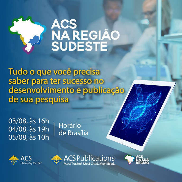 A American Chemical Society (ACS) https://www.acs.org, maior sociedade científica do mundo, tem o prazer de convidar estudantes, pesquisadores, professores, bibliotecários e demais profissionais para o primeiro ACS na Região Sudeste. Esse evento será oferecido em três diferentes dias e horários para facilitar a participação dos interessados. Dia 03/08, às 16h; dia 04/08, às 19h e dia 05/08, às 10h.